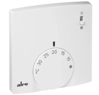 Elektromechanischer Raumtemperaturregler im superflachen Aufputzgehäuse (nur 13,9 mm tief) zur Regelung oder Überwachung von Temperaturen in Büros, Wohnräumen und Hotels. Durch die thermische Rückführung wird eine sehr genaue Schaltdifferenz erreicht. Mit der unter dem Einstellknopf befindlichen Bereichseinengung kann der Einstellbereich verändert werden. Das Gerät wird mittels Aufputz-/Wandmontage (4-Loch-Befestigung auf UP-Dose) montiert. Geeignet für 2-Rohr Anlagen, vor allem Wärmepumpen. Die Heiz-/Kühlumschaltung erfolgt mit einem Schalter am Gerät.
