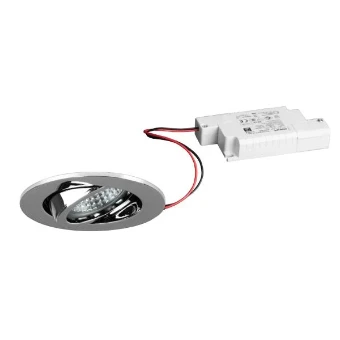 LED recessed spot set, trailing-edge phase dimmable, chrome, Round. In a compact design, for installation in tool-less rapid assembly systems. Set including a converter for 230-V mains voltage, trailing-edge phase dimmable, dimensions of converter: L 110 x W 50 x H 19 mm Mounting method: Recessed mounting, Place of installation: Ceiling-mounted, Material: Aluminium / Glass / Plastic, Degree of protection: according to DIN EN 60529 IP20, Protection class: (EN 61140) II, Voltage: 230V AC 50Hz, Power: 6W, Amount of light sources / fittings: 1.0 Qty, Luminous flux: 680lm, Colour temperature: 3.000 K, Beam angle: 38°, Adjustability: Pivoted, With control gear: Yes, Dimmable: Yes, Control: Trailing-edge phase.
