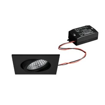 LED recessed spot set, on/off switchable, black, Square. In a compact design, for installation in tool-less rapid assembly systems. Set including a converter for 230-V mains voltage, on/off switchable, dimensions of converter: L 68 x W 35 x H 21 mm Mounting method: Recessed mounting, Place of installation: Ceiling-mounted, Material: Aluminium / Glass / Plastic, Degree of protection: according to DIN EN 60529 IP20, Protection class: (EN 61140) II, Voltage: 230V AC 50Hz, Power: 6W, Amount of light sources / fittings: 1.0 Qty, Luminous flux: 680lm, Colour temperature: 3.000 K, Beam angle: 38°, Adjustability: Pivoted, With control gear: Yes, Dimmable: No, Control: on/off.