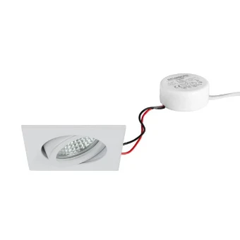 LED recessed spot set, trailing-edge phase dimmable (round converter), white, Square. In a compact design, for installation in tool-less rapid assembly systems. Set including a converter for 230-V mains voltage, trailing-edge phase dimmable, dimensions of converter: D 51 x H 24 mm Mounting method: Recessed mounting, Place of installation: Ceiling-mounted, Material: Aluminium / Glass / Plastic, Degree of protection: according to DIN EN 60529 IP20, Protection class: (EN 61140) II, Voltage: 230V AC 50Hz, Power: 6W, Amount of light sources / fittings: 1.0 Qty, Luminous flux: 680lm, Colour temperature: 3.000 K, Beam angle: 38°, Adjustability: Pivoted, With control gear: Yes, Dimmable: Yes, Control: Trailing-edge phase.