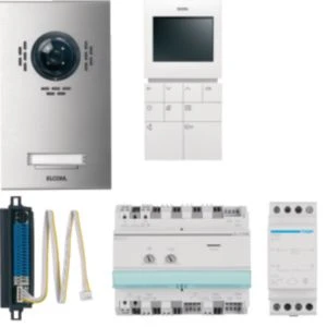 VSA-1EM VideoSet 1 Teilnehmer AP 2D-Video Edelstahl ESTA/BVF-510.Aufputz Video-Set als Elektronikpaket für Sprechanlage/Intercom nach DIN EN 50486 in 2Draht-Video-Technik. Video-Set bestehend aus Innenstation mit Video-Innenstation (Aufputz), Außentürstation mit Kamera/Türelektronik-Kombination (Aufputz), Tastenexpander, Strangversorgung, Video-Netzgerät und Netztransformator. AP-Außentürstation mit 2 mm dicken Frontplatte aus Edelstahl matt gebürstet mit Lochsprechöffnungen, Lautsprecher, Kamera, Spezialschrauben, Namensschild (von vorn wechselbar) mit LED-Beleuchtung und UP-Gehäuse 35 mm Tiefe. Farb-Einbaukamera mechanisch verstellbar (Schwenkbereich 174 Grad) mit automatische Umschaltung von Farbe auf S/W-Betrieb bei Dunkelheit (Infrarotbeleuchtung), integrierter Lautsprecher und Mikrofon-/Lautstärkeregler. Video-Innenstation mit weißer Designblende, 8,9 cmTFT-Farbdisplay, Onscreen-Menüführung und Touchsensor-Tasten.