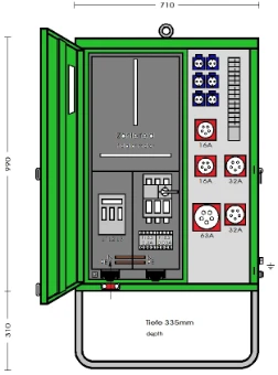 Anschlußverteiler- Endverteilerschrank 44 kVA,mit Untergestell, 1x FI 63/0,3A Typ B, 1x CEE 563/6h, 1x FI 63/0,03A Typ B, 2x CEE 532/6h, 2x CEE 516/6h, 6x Schutzkontakt- Steckdosen