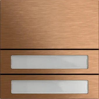 System 106 call-button module bronze 2-gang - Easy-to-use, vandal-proof, and scratch-resistant call buttons. - Function changes, e.g from 2-gang to 4-gang, can be easily implemented by replacing the buttons. - Various inscription options possible. Professional inscription by the Gira inscription service{b}www.beschriftung.gira.de{\b}.