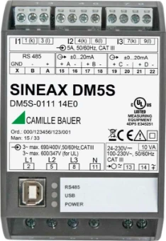 Multi-Messumformer, prog.bar, ..32 Zähler, USB, RS485-MODBUS. Der SINEAX DM5 ist ein frei programmierbares Universal-Messgerät für Starkstromnetze: Ein klassischer Messumformer hoher Genauigkeit, geeignet für Überwachungsaufgaben und Retrofit-Anwendungen in Energieverteilung und Industrie. . Das Gerät lässt sich - auch ohne angeschlossene Hilfsenergie - mit Hilfe der CB-Manager Software schnell und einfach an die Messaufgabe anpassen. Je nach Ausführung werden die Messwerte proportional auf analoge DC-Stromausgänge und / oder eine Modbus-Schnittstelle abgebildet. Die Messung erfolgt unterbruchsfrei in allen vier Quadranten und kann optimal an das zu überwachende Netz angepasst werden. Sowohl die Mittelungszeit der Messung als auch die erwartete maximale Signalhöhe können parametriert werden. Die Inbetriebsetzung kann sehr einfach erfolgen und wird durch die Service-Funktionen Typenschild-Druck, Anschluss-Kontrolle, Messwertaufzeichnung sowie Simulation und Trimmung der Analogausgänge unterstützt.. Netzzustands-Überwachung: Klasse 0.2Universell: U/I, P/Q/S, f, PF usw.Fernkommunikation via ModbusKonfiguration ohne HilfsenergieDM5S: Energiemessung: Klasse 0.5S. Messgerät SINEAX DM5S Sicherheitshinweise (mehrsprachig)