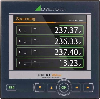 Transparente Überwachung von Netzqualität und Energieverbrauch. Der SINEAX AM1000 ist ein Kompaktgerät für die Messung und Überwachung in Starkstrom-Netzen. Er besticht durch die Qualität der Anzeige und die intuitive Bedienung. Das Gerät stellt eine breite Funktionalität zur Verfügung, welche sich mit optionalen Komponenten noch weiter ausbauen lässt. Das moderne, mehrsprachige Design erlaubt das Gerät intuitiv über die Geräte-Website (Option Ethernet erforderlich) oder das hochauflösende Farb-TFT Display (320x240px) zu bedienen oder zu parametrieren. Der Webserver ermöglicht die Fernabfrage, Anzeige und Analyse der Messdaten. Es ist keine zusätzliche Software erforderlich. . Netzzustand Bereitstellung aller Spannungen, Ströme, Leistungen, Leistungsfaktoren alle 10/12 Perioden Erweiterte Blindleistungsanalyse Varianz der Netzgrössen mit Zeitreferenz Energiefluss-Analyse Leistungsmittelwerte mit Trendanalyse zur Vermeidung von Lastspitzen Optional: Lastgang-Speicherung mit Schwankungsbandbreite (Min/Max) pro Intervall Wirk-/Blindenergie Klasse 0.5S (HT/NT, Bezug/Abgabe), programmierbare Auflösung Weitere Mittelwerte und Zähler mit wählbarer Basisgrösse Netzqualität Oberschwingungsanalyse nach IEC61000-4-7 Bewertung der Unsymmetrie der Spannungen und Ströme Vektor- und Drehrichtungsanzeige zur Anschlusskontrolle Kurvenformdarstellung Optionaler Störschreiber für PQ-Ereignisse (Spannungseinbruch, Spannungsüberhöhung, Spannungsunterbruch) nach IEC 61000-4-30 Ed.3 mit RMS1/2- und Kurvenformspeicherung Hardware-Option Analogausgänge ±20mA (2/4), Relaisausgänge (2), Digitaleingänge (4) aktiv / passiv, GPS-Zeitsynchronisation, Fehlerstromerkennung (Differenz- oder Erdleiterstrom), Temperaturüberwachung (Pt100, PTC), IEC61850 oder Profinet I/O Kommunikation Optional: Ethernet (Modbus/TCP, http/https, NTP, SFTP, SYSLOG), IEC61850, Profinet I/O, Modbus/RTU Automatisierter Daten-Export auf SFTP-Server (Option Ethernet erforderlich) Security (Option Ethernet erforderlich) Flexible Rollenbasierte Zugriffskontrolle Verschlüsselte Kommunikation via HTTPS Audit-Log registriert alle sicherheitsrelevanten Vorgänge, Unterstützung von SYSLOG für den Transfer an zentralen Überwachungsserver Client-Whitelist: IP-Adressliste zur Einschränkung der zugriffsberechtigten Rechner Digitale Firmware-Signatur: Manipulierte Firmware-Dateien können nicht ins Gerät eingespielt werden Weitere Eigenschaften 3 Strom- und 3 Spannungsmesskanäle mit 0.2% Genauigkeit, Direktmessung oder über Wandler Messkategorie 600V, CAT III (Spannung), 300V,CAT III (Strom) Standard-I/Os: 1 Digitalausgang, 1 Digitaleingang / -ausgang Datenlogger mit 16 GB Datenspeicher (Option) Abtastrate: 18kHz Überwachung und Alarmierung via Grenzwerte und Überwachungsfunktionen Für Schalttafel-Einbau 96x96mm Identische Bedienung wie Geräte der PQ/CU/DM-Reihe.
