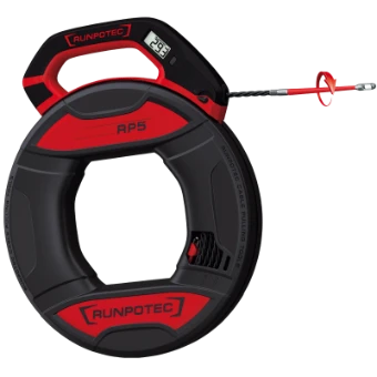 Die RP5 - RUNPOTEC Polyester Ø 5,5 mm ist ein Kabeleinziehwerkzeug inkl. digitalem Meterzähler (zur Längenermittlung von Rohren/Kabeln oder zur Erstellung von Kabellisten). Das dreifach verdrillte Spezialkunststoffband Ø 5,5 mm verfügt über eine noch bessere Schubwirkung als der Glasfaserstab Ø 3 mm und der Reibungswiderstand ist aufgrund seiner punktuellen Auflage nur halb so groß. Die patentierte RG7 - Führungsspitze mit Drallausgleich Ø 5,5 mm (am Bandanfang und -ende verpresst) ermöglicht das Überwinden engster Radien (Biegeradius 15 mm). Die RP5 - RUNPOTEC Polyester Ø 5,5 mm ist in einer baustellentauglichen und robusten Aufbewahrungsbox mit ergonomischem Tragegriff verstaut. Diese ist mit der neuen Rückschub-Sicherung ausgestattet, die das unabsichtliche Rückrutschen des Kabeleinziehbandes verhindert. Die Maßeinheit des Meterzählers kann von Metrisch (m) auf Imperial (ft) umgestellt werden. Die Gesamtbruchlast von unglaublichen 270 kg bezieht sich auf das gesamte Einziehsystem. Arbeits- und zeitaufwendige Reparaturarbeiten entfallen, da dieses Kabeleinziehsystem nahezu bruchfrei ist. Die RP5 ist in den Längen 20 m und 30 m erhältlich. Das RP5 Ersatzband 40 m kann nicht in der Box verstaut werden. Optimales Einsatzgebiet: für Rohrinnendurchmesser von 9 - 32 mm ANWENDUNGSFILM: Einen kurzen, sehr informativen Anwendungsfilm können Sie durch Scannen des QR-Codes oder auf www.runpotec.com ansehen. Lieferumfang: 1 x RP5 Kabeleinziehsystem Ø 5,5 mm inkl. Meterzähler in Kunststoffbox, Länge 20 m, inkl. 2 x RG7 - Führungsspitze mit Drallausgleich (beidseitig verpresst)