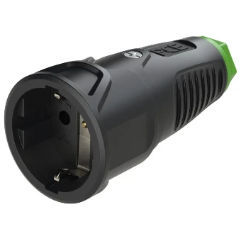 Schutzkontaktkupplung Serie TAURUS2 - Vollgummi; Farbe (Haube/Ring): schwarz/grün; Material (Haube/Kontaktträger): TPE/TPE; Schutzkontaktsystem: österr./deutsch ; 16A / 250V AC / 3p (2P+E), Schutzart: IP20