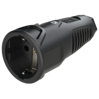Schutzkontaktkupplung Serie TAURUS2 - Vollgummi; Farbe (Haube/Ring): schwarz/schwarz; Material (Haube/Kontaktträger): TPE/TPE; Schutzkontaktsystem: österr./deutsch ; 16A / 250V AC / 3p (2P+E), Schutzart: IP20