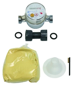 Umrüstsatz für Wasserenthärtungspatrone zum Schutz vor kalkhaltigem Wasser, bestehend aus: Nachfüllgranulat und Einbausatz Wasser- Wasserzähler