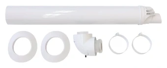 Dach-/Wanddurchführung Brenn- wert, waagerechte Luft-/Abgasführung, für raumluftunabhängige Betriebsweise, konzentrische Luft-/Abgasführung (60/100 mm PP), einsetzbar durch Schrägdach und Außenwand, bestehend aus: - Revisionsbogen 60/100 87 Grad - Mündungsrohr 60/100 mm 0,8 m - Verbindungsschellen und Rosetten