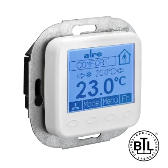 Der alre BACnet Einzelraumregler mit grafischem Display wurde speziell für den zeitabhängigen Heiz- und Kühlbetrieb in 2- oder 4-Rohr-Systemen entwickelt. Der Regler kann in vielfältigen Bereichen eingesetzt und angewendet werden, wie zum Beispiel im Hotel, Wohn-, Büro- und Geschäftsräumen sowie in Krankenhäusern und Schulen. Das Gerät besitzt zwei Ein- und drei Ausgänge. Zwei der Ausgänge schalten Relais, die jeweils bis zu 5 Stellantriebe ansprechen können. Der dritte Ausgang ist analog ausgeführt (0–10 V) und kann z. B. für die EC-Lüftersteuerung verwendet werden. Einer der beiden Eingänge dient zur BACnet-Kommunikation, der andere ist konfigurierbar für den Anschluss von Sensoren z. B. für Temperatur oder Taupunkt. Über BACnet können Fenster oder Präsenzkontakte verbunden werden. Passend in alle gängigen Schalterprogramme. Der alre BACnet-Einzelraumregler wird in der Unterputzdose montiert. Das Gehäuse passt exakt in die Designrahmen der Größen 50 x 50 mm, 55 x 55 mm und 60 x 60 mm aus den Flächenschalterprogrammen namhafter Hersteller wie z. B. Berker, Busch-Jaeger, Gira, Jung, Merten, Peha, Hager oder Feller (CH). Sonderfarben für Projekte auf Anfrage. Die Kommunikation erfolgt mittels BACnet gemäß DIN EN ISO 16484-5 mit dem Netzwerkprotokoll BACnet MS/TP. Damit ist der Raumregler mit allen gängigen Systemen der Gebäudeautomation kompatibel. Der Regler entspricht dem BACnet-Profil “B-AAC“ (BACnet Advanced Application Controller) und ist somit weit mehr als ein einfacher Sollwertgeber. Im Unterschied zu anderen Feldbusschnittstellen wie z. B. LON oder KNX kommt die BACnet-Schnittstelle ohne zusätzliches Gateway zur Umsetzung und Kommunikation mit der Managementebene aus. Das spart Kosten, denn zur Inbetriebnahme des Systems werden keine Servicetechniker mit unterschiedlichen Qualifikationen benötigt. Eine weitere Kosteneinsparung gegenüber verteilten Lösungen bringt die Verbindung von Raumbediengerät und Einzelraumregler in einem Gerät. Mit den vordefinierten Applikationen sind vielfältige Anwendungen für Raumtemperierungen in der Raumautomation abgedeckt. Der BACnet Raumregler wurde mit dem BTL Zertifikat für die Einhaltung des BACnet Standard ISO 16484-5 ausgezeichnet, der mittels BTL-Konformitätstest nachgewiesen wurde.