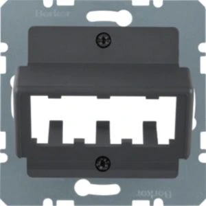 Zentralplatte für 3 MINI-COM Module Zentralplattensystem anthrazit matt/samt.Zentralplatte mit Tragplatte geeignet für Mini-Com Module, 30° Schrägauslass, ohne Spreizkrallen. Hinweis: Nur mit Zwischenring des Schalterprogramms zu verwenden. Beschriftungsfeld einrastbar in passenden Zwischenring.