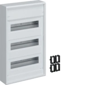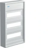 Kleinv., Volta, APV, 3x12PLE, IP30, ohne Tür.Installationskleinverteiler Aufputz aus Kunststoff, nach DIN VDE 60670-24 und DIN 43871, geeignet zum Einsatz in Wohngebäuden nach DIN 18015. Zum Einbau von Geräten bis 63 A mit max. 70 mm Einbautiefe nach Maßnorm DIN 43880. Bemessungsspannung 400V/50Hz. Schutzart IP30, Schutzklasse II schutzisoliert. Bestehend aus Kunststoffbodenplatte mit serienmäßigem Leitungsabfang, Geräteträger aus verzinktem Stahlblech und DIN Hutschiene zum Einbau von Modulargeräten nach DIN 43880. Geräteabdeckung aus Kunststoff mit 46 mm Geräteschlitz, serienmäßig plombierbar. Fingersichere PE/N-Klemme mit Stecktechnik in montagefreundlicher Schnapptechnik und N-Klemme für FI-Kreise. Hinweis: Tür aus Stahlblech ist nicht enthalten (Zubehör).