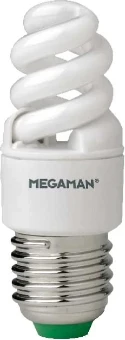 Energiesparlampe in Spiralform von Megaman. Warmton, zur allgemeinen Beleuchtung von Wohnräumen. Longlife: 10.000h.