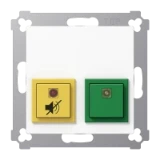 (Schraubbefestigung, ohne Befestigungskrallen) ohne Rahmen Die Dienstzimmereinheit kann zusätzlich zu den Komponenten des Notrufsets installiert werden, z.B. in einem Personal- oder Empfangsraum. Eine grüne Taste markiert die Anwesenheit, eine gelbe Taste unterdrückt das akustische Notrufsignal des Rufmoduls für 20 Sekunden. Material: Thermoplast