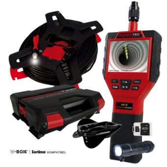 RC2 Inspektionskamera mit 6 integrierten LEDs in den Kabellängen 10 m, 30 m und 50 m mit Spule inkl. Monitorhalterung erhältlich. Im praktischen W-Boxx Systemkoffer der kompatibel zu Sortimo ist. Display: Extra großes 3.5“ TFT LCD 16M Color Display Schutzklasse: IP 67 (Kamerakopf und Kabel) Akkulaufzeit: bis zu 6 Std Dauerbetrieb Beweissicherung: Speichern von Fotos, Videos und Audioaufnahmen Kamerakopf: mit 6 integrierten LED, eingefasst in robustem Edelstahlkopf (Ø 13 mm) mit RTG Ø 6 mm Innengewinde. Kompatibel zu allen RUNPOTEC Produkten mit Gewinde RTG Ø 6 mm (GF3, RUNPOSTICKS, RP 1, Glasfaserstab GF4.5 - GF15). Achtung: Anwendung nur in Kombination mit RUNPOTEC Einschubsystemen möglich! Optimales Einsatzgebiet: Für Rohrinspektionen über lange Distanzen bis zu 50 m. Ab 14 mm Innendurchmesser (entspricht Leerrohr Ø 20mm), aber auch für größere Rohrquerschnitte (Lüftungsanlagen, Drainagen, Abwasserrohre usw.). In Kombination mit den RUNPOSTICKS hervorragend für Hohlwandinspektionen, abgehängte Decken (über hohe Deckenprofile), Schächte- und Unterflurkanäle, Wartungs- und Anlageninspektion geeignet ANWENDUNGSFILM: Einen kurzen, sehr informativen Anwendungsfilm können Sie durch Scannen des QR-Codes oder auf www.runpotec.com ansehen. Lieferumfang: 1 x RC2 Inspektionskamera mit Kabel 50 m inkl. Spule, 1 x RUNPOTEC Systemkoffer, 1 x RG 7 RUNPOGLEITER mit Frontgewinde, 1 x Systemgleiter, 1 x LED-Akku-Hochleistungslampe 320 Lumen, 1 x Micro Memory Card 8 GB, 1 x Magnet Fang-Set, 1 x Verbindungsgewinde Set RTG Ø 6 mm (3-teilig), 1 x Fanghaken, 1 x Aufsatz biegsam 12 cm, 1 x USB-Kabel 1,5 m, 1 x USB-Ladestecker 230 V, 1 x Gewindeaufsatz RC2
