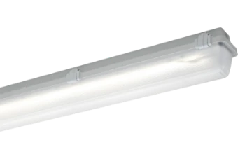 LED-Notleuchte, 29 W, 4240 lm, selbst Versorgung (MA), Selbsttest, Betriebsdauer 3 h, SKI, IP65, symmetrisch-breitstrahlend, 4000 K, Ra≥ 80, Ta 0 °C/+30 °C, L70>100000 h (@ Ta max), L80>70000 h (@ Ta max), L90>50000 h (@ Ta 25°C), Wanne PMMA satiniert, Verschluss Kunststoff, Gehäuse glasfaserverstärktes Polyester, Farbe grau, EAN/GTIN:4041254429618.Robuste LED-Feuchtraum-Notleuchte, selbstversorgt mit automatischer Überwachung gemäß EN62034. Hochschlagfestes glasfaserverstärktes Polyestergehäuse und satinierte Abschlusswanne mit hoher Schlagfestigkeit. Mehrteilige unverlierbare Verschlussklammern, davon zwei Sicherheitsverschlüsse, Silikondichtung. Lackierter Aluminiumreflektor mit aufmontierten elektrischen Komponenten, hocheffizienten Zhaga-konformen LED-Modulen und Abdeckung der LED-Module (Berührungsschutz). Batterie mit Temperaturüberwachung, kurzschlussfestem Anschluss, Verpolungsschutz und Tiefentladeschutz. Automatische Überwachung mit optischer Anzeige der Prüfergebnisse.