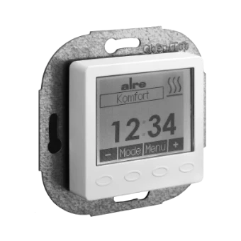 Universeller Unterputz-Temperaturregler zur zeitabhängigen Einzelraum- oder Fußbodentemperaturregelung für Elektro- und Warmwasserheizungen (stromlos geschlossene Stellantriebe). Dabei kann das Gerät als Raumtemperaturregler (wahlweise auch mit optionalem externen Raumfühler), mit optionalem Fernfühler auch als Raumtemperaturregler mit Fußbodenüberwachung oder als Fußbodentemperaturregler eingesetzt werden. Dieser Uhrenthermostat besitzt eine Wochenuhr mit individuell einstellbaren Programmen (Werkseinstellung auf „normale“ Tagesabläufe). Einfachste Handhabung durch intuitive Bedienung, Kostenoptimierung durch zeitgesteuerte Regelung auf die gewünschten Temperaturen. Beleuchtetes, grafikfähiges Display. Komfortable Montage durch freie Verdrahtung der steckbaren Schraubklemmen.