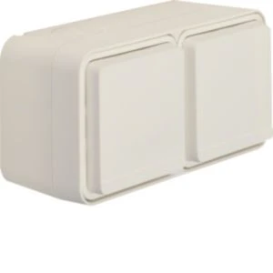 Steckdose SCHUKO 2fach waagerecht mit Klappdeckel 2 Schieber W.1, polarweiß.Steckdose SCHUKO® 2-fach waagerecht mit Klappdeckel AP, IP55. Für waagerechte Montage, Einsätze durchverdrahtet, mit Steckklemmen, mit einer Einführung für 2 Leitungen und einer Einführung für Leitung oder Rohr, die obere und untere Einführung für Leitungen sind seitlich angeordnet und daher besonders geeignet für die Montage neben Türrahmen o. ä. vollflächige Dichtung unter dem Gehäuseboden zur Abdichtung der Gehäuserückseite, mit zufallendem Klappdeckel, manuell einrastbar, um den Schutzgrad IP55 zu erreichen, gut zugängliche, trichterförmige Montagelöcher in den Gehäusen, eine Wago 2-Leiter Verbindungsklemme für Verdrahtung beiliegend, zwei Einrastplätze für Wago 2-Leiter Verbindungsklemmen im Gehäuseboden, viel Platz zur Verdrahtung unter den Sockeln der Einsätze (Hohlboden), einfache Montage des Einsatzes im Gehäuse durch Einrasten, sichere Fixierung des Rahmens am Gehäuse über Bajonett-Schnellverschluss, Verbindungsklemmen nach VDE 0620, Bauart DIN 49440. Gehäuseschrauben und Klappdeckelfedern aus Edelstahl Rostfrei. Aufputz-Installation. Material: Kunststoff, Thermoplast, schlagfest.