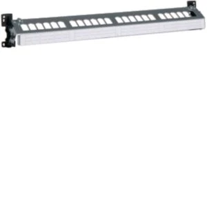 Patch-Panel 24-fach (E-Dat), ohne Module für Hutschiene oder geschraubt.Patchpanel leer zum Einbau in Multimediafelder auf DIN-Hutschienen, Tragschienen und Montageplatten bestehend aus Universalhalterung aus verzinktem Stahlblech mit Ausschnitte für Datenmodule, isolierter Kunststoffträger für Rastung auf Hutschiene, Verschraubung auf Montageplatten oder Tragschienen in Verteilerschränken und Bezeichnungsstreifen. Hinweis: Vom Patchpanel ist eine Leitung zur Potentialausgleichsschiene (Funktionspotentialausgleich nach DIN EN 50310, VDE 0800-2-310) miteinander zu verbinden (nicht enthalten).