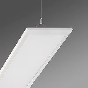 Extrem flacher Aluminium Rahmen weiß gepulvert, Bauhöhe 13mm, Lichtverteilung direkt/indirekt strahlend mittels Diffusor micro-prismatisch aus PMMA, direkt strahlend mittels Micro-Prismenscheibe, die indirekte Lichtverteilung mit dezent strahlender diffuser Scheibe. Geeignet für Bildschirmarbeitsplätze, rundumentblendet 65° < 3000 cd/qm nach aktueller Norm DIN-EN 12464-1. Externer LED Treiber im Baldachin integriert. Elektrischer Anschluss über integrierte weiße Anschlussleitung 3x0,75mm² mit Stecksystem..
